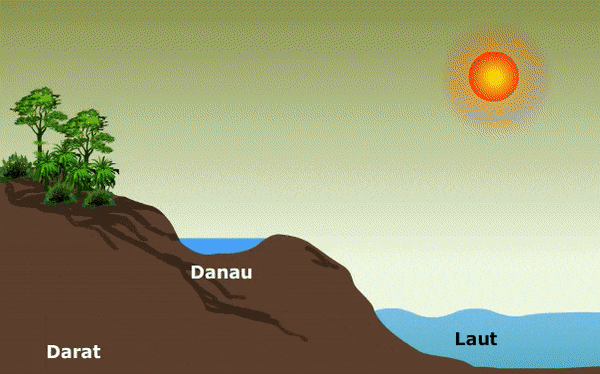 Air laut mengalami penguapan, lalu terjadi kondensasi dan membentuk awan. Awan tertiup angin dan terbawa ke daratan kemudian terjadi hujan di daratan. Sebagian air hujan akan meresap ke dalam tanah, mengalir ke permukaan, dan kesudahannya menuju ke bahari.