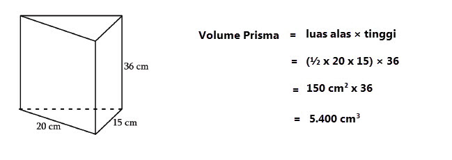 Luas alas x tinggi = 150 cm² x 36 cm = 5.400 cm³